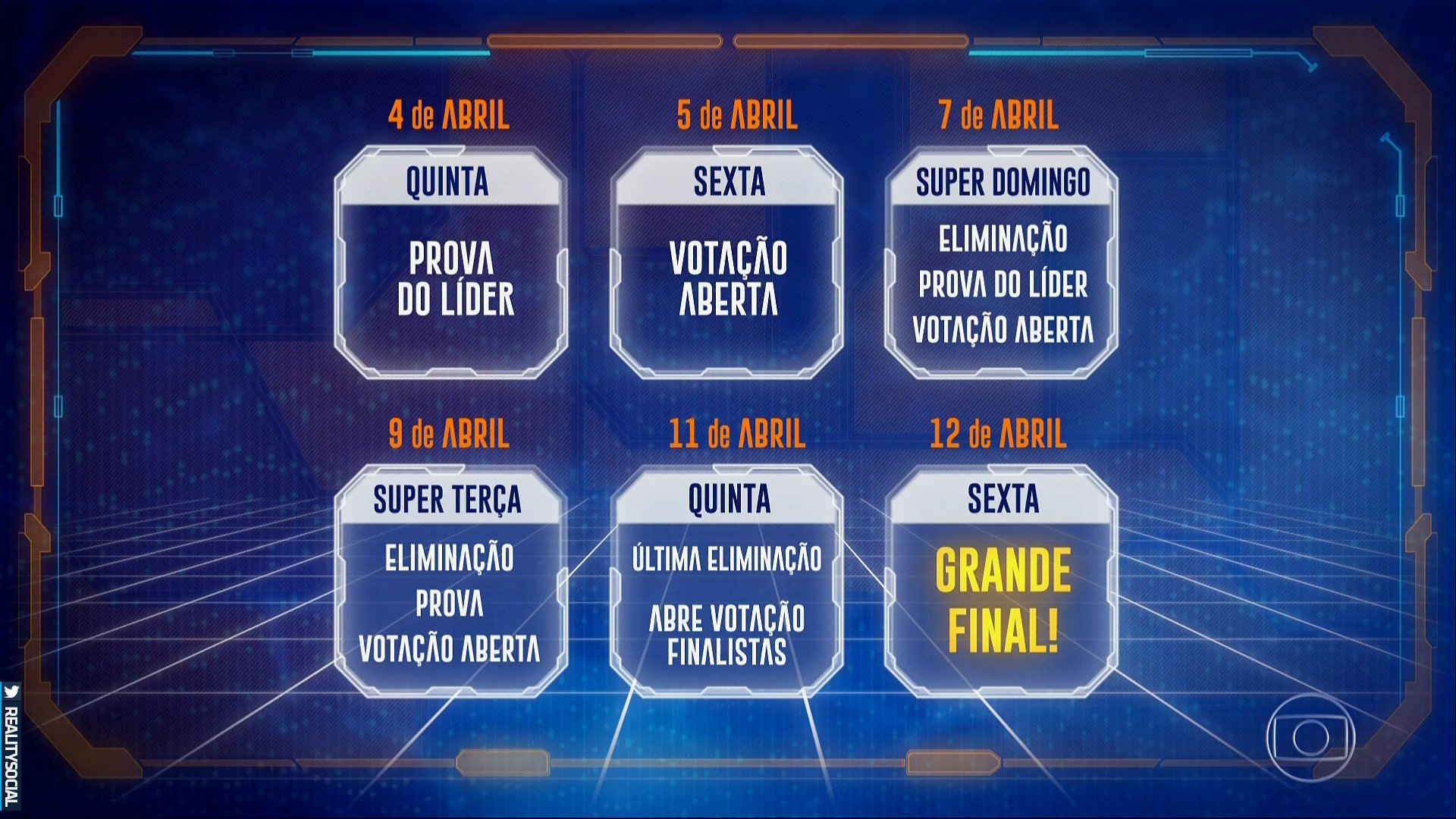A 19ª edição do "Big Brother Brasil" está chegando ao fim e agora é aquela correria. Começou nesta quinta-feira (4) a prova de resistência que decidirá o próximo líder e ela promete ser bem difícil. Presos a um carro, os participantes enfrentarão diversos tipos de temperaturas e climas, bem parecido com o que já rolou em outras edições. Além disso, Tiago Leifert já avisou que os paredões triplos chegaram ao fim! Pois é, agora serão dois brothers por berlinda e isso pode mudar um pouco o resultado do jogo. Veja como ficou o cronograma do reality: